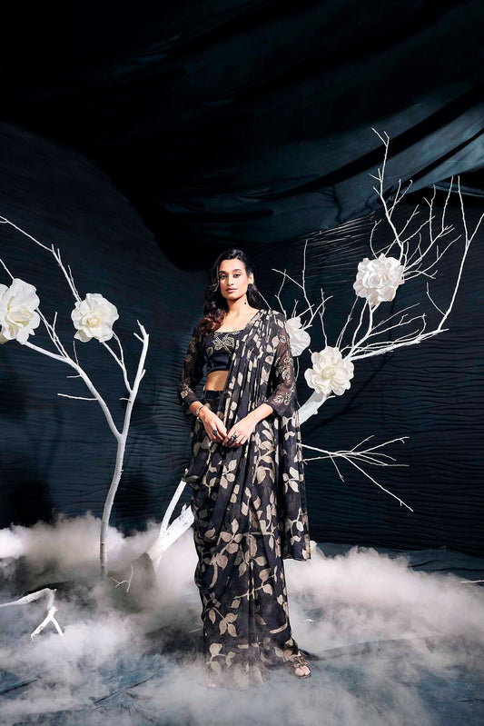 Black Printed Organza Drape Saree With Hand Embroidery