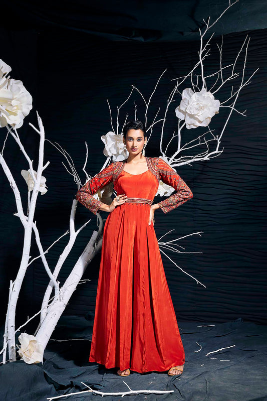 Rust Crepe Embroidered Jumpsuit