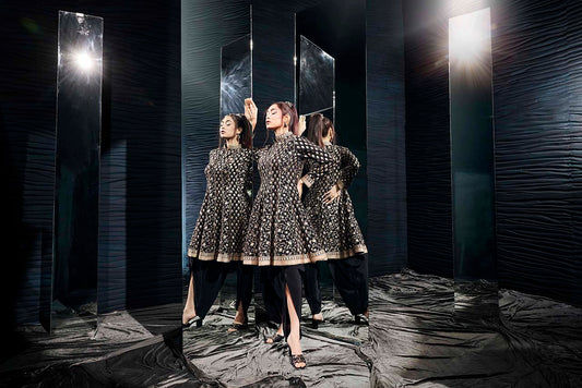 Black Weaving Dhoti-Kurta Set In Crepe