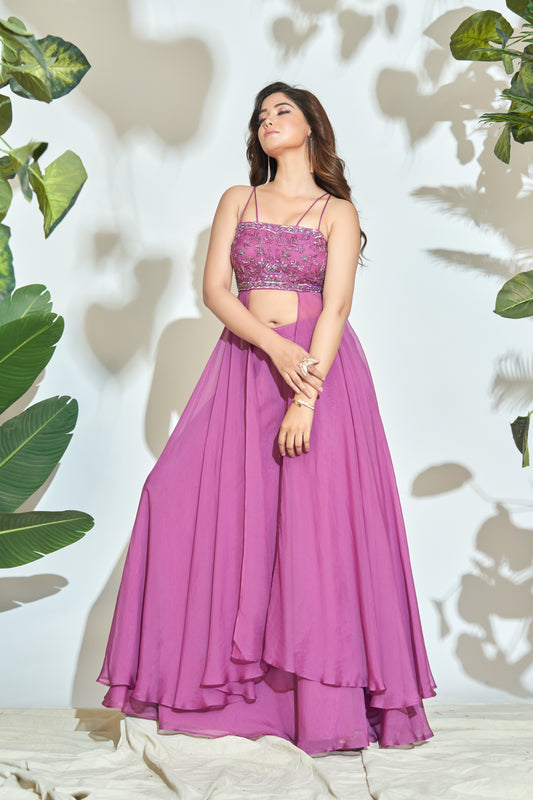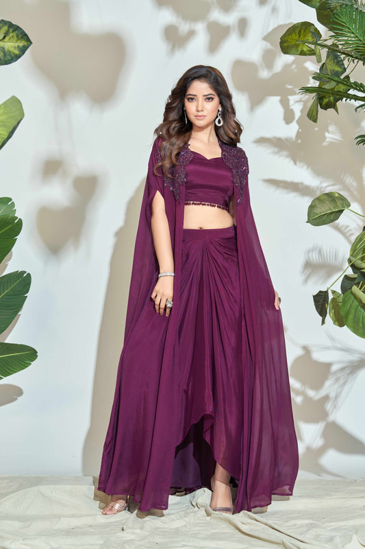 WINE CHIFFON HAND WORK SHRUG WITH PLEATED SKIRT AND TOP SET
