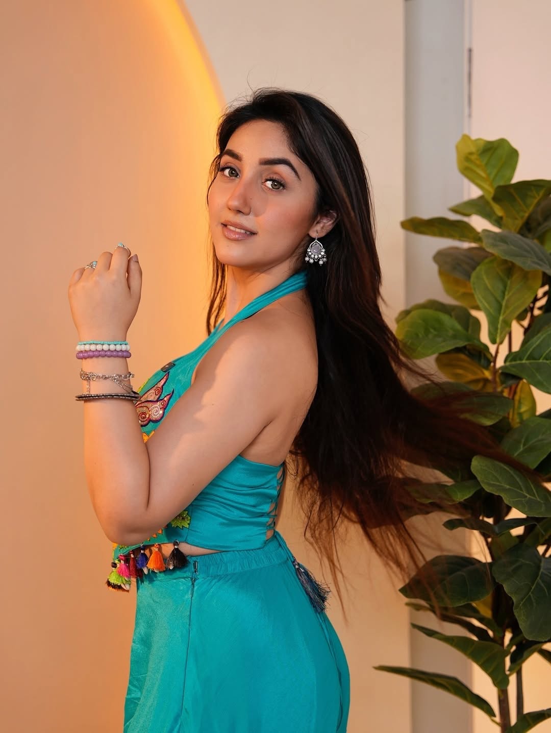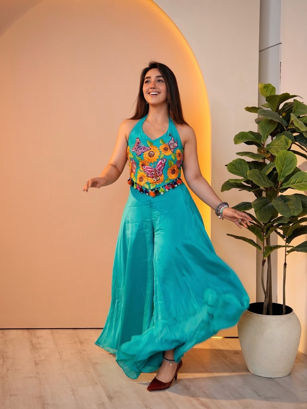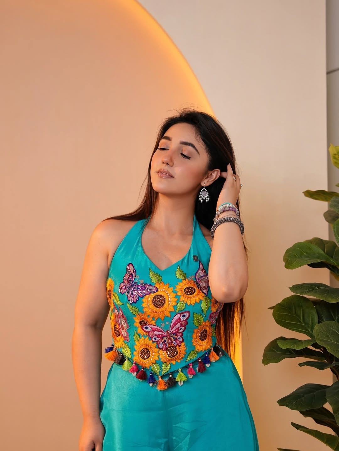 Work- machine embroidery with colourful thread work and sequins, focused on floral and butterfly patterns. Decorative bead embellishments on the waistline.