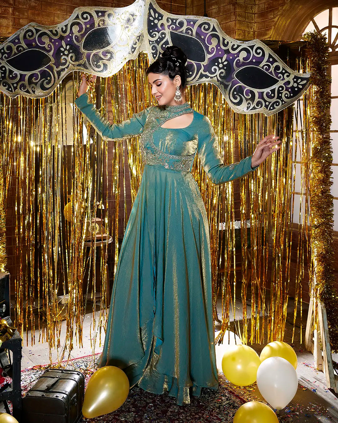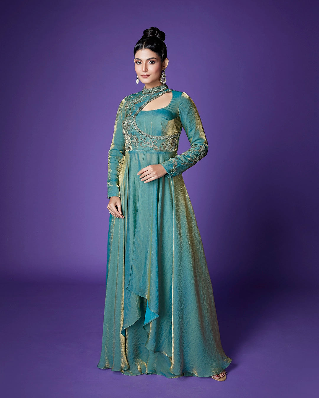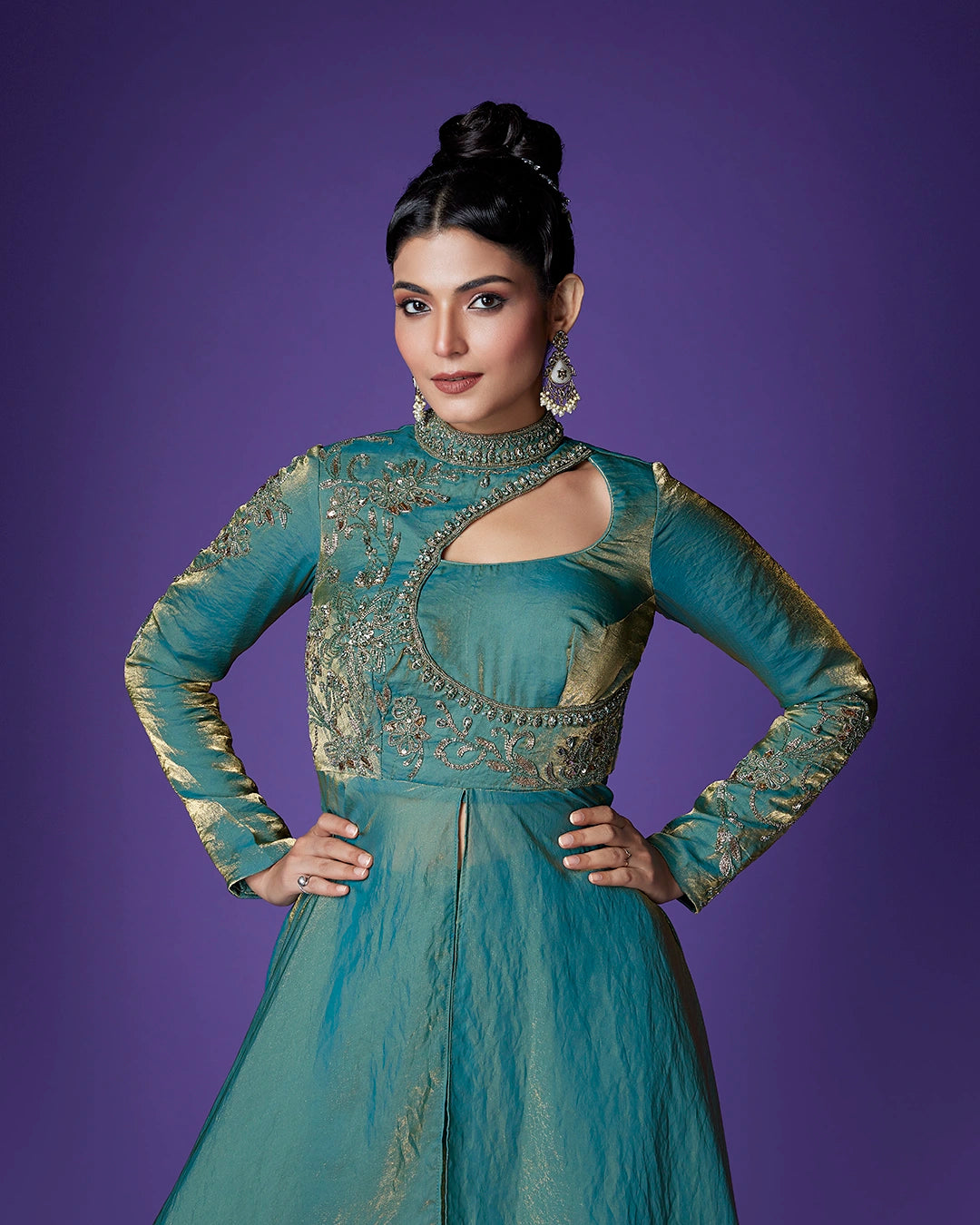 Neckline - High neck with asymmetrical cut-out detail and embellished border