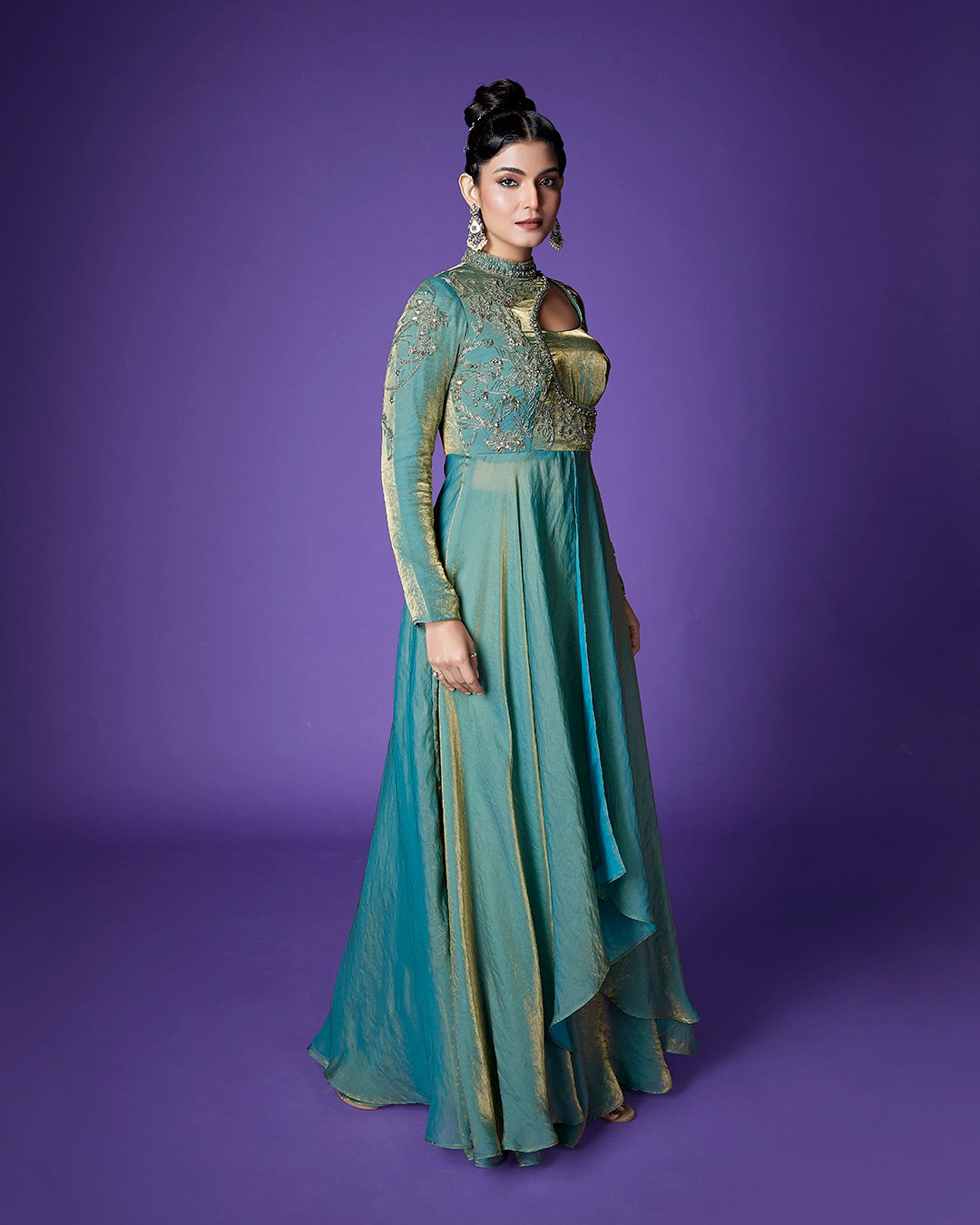 Work - Intricate floral embroidery with zari, resham, and sequin work on the bodice.