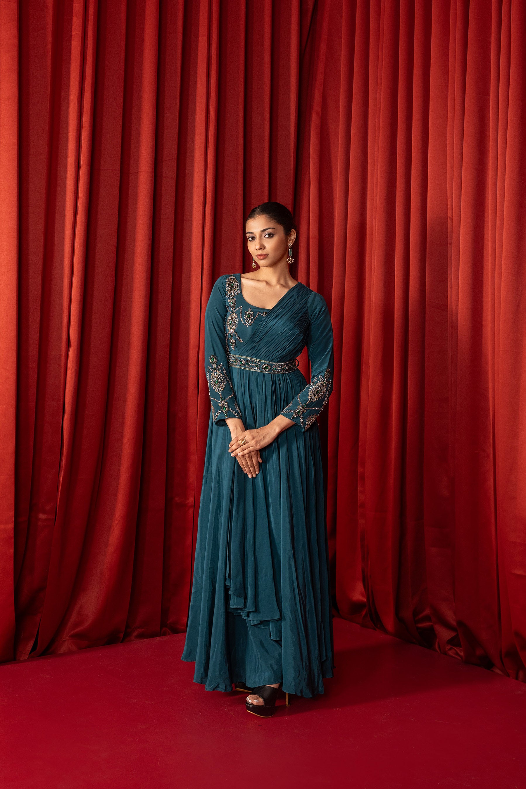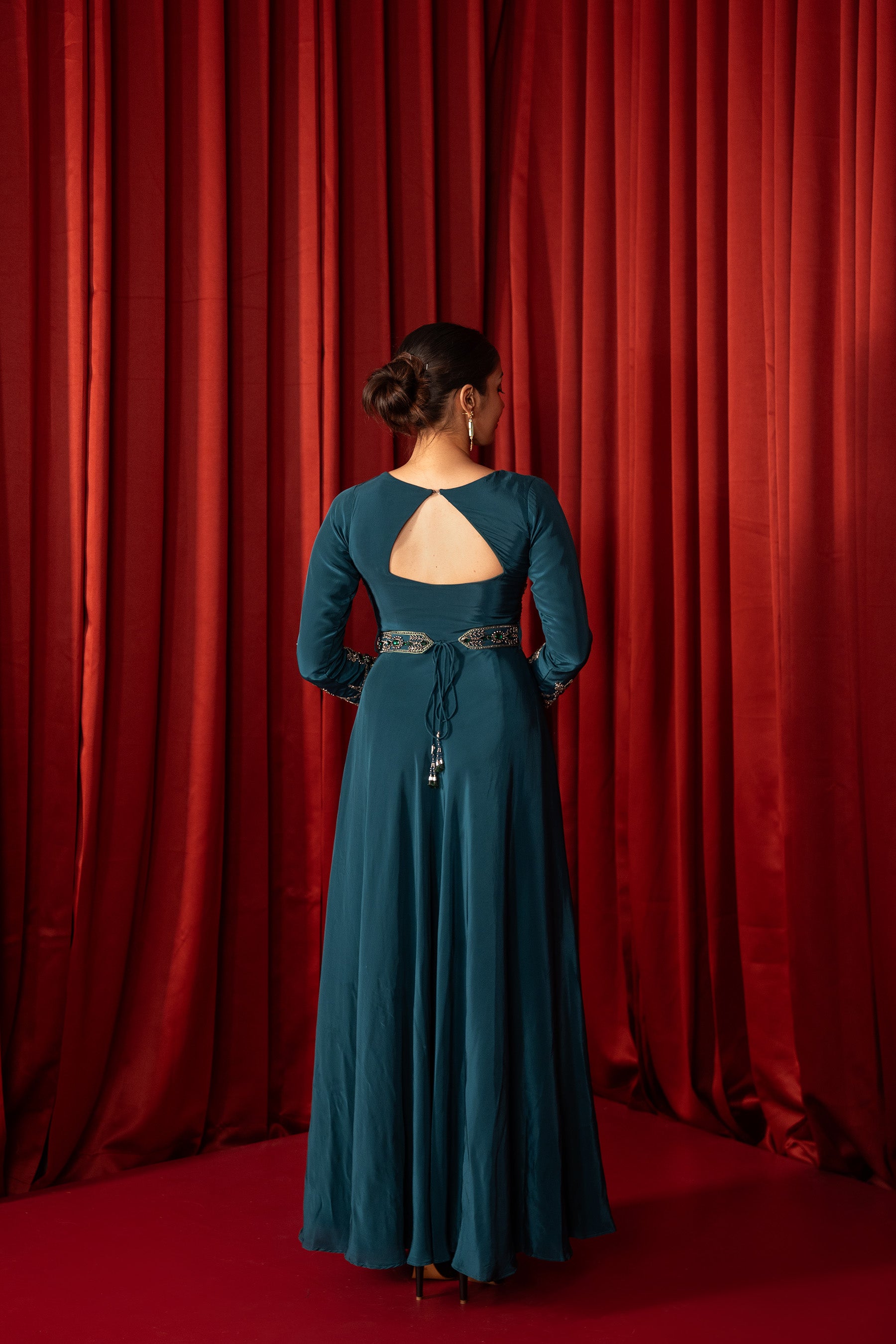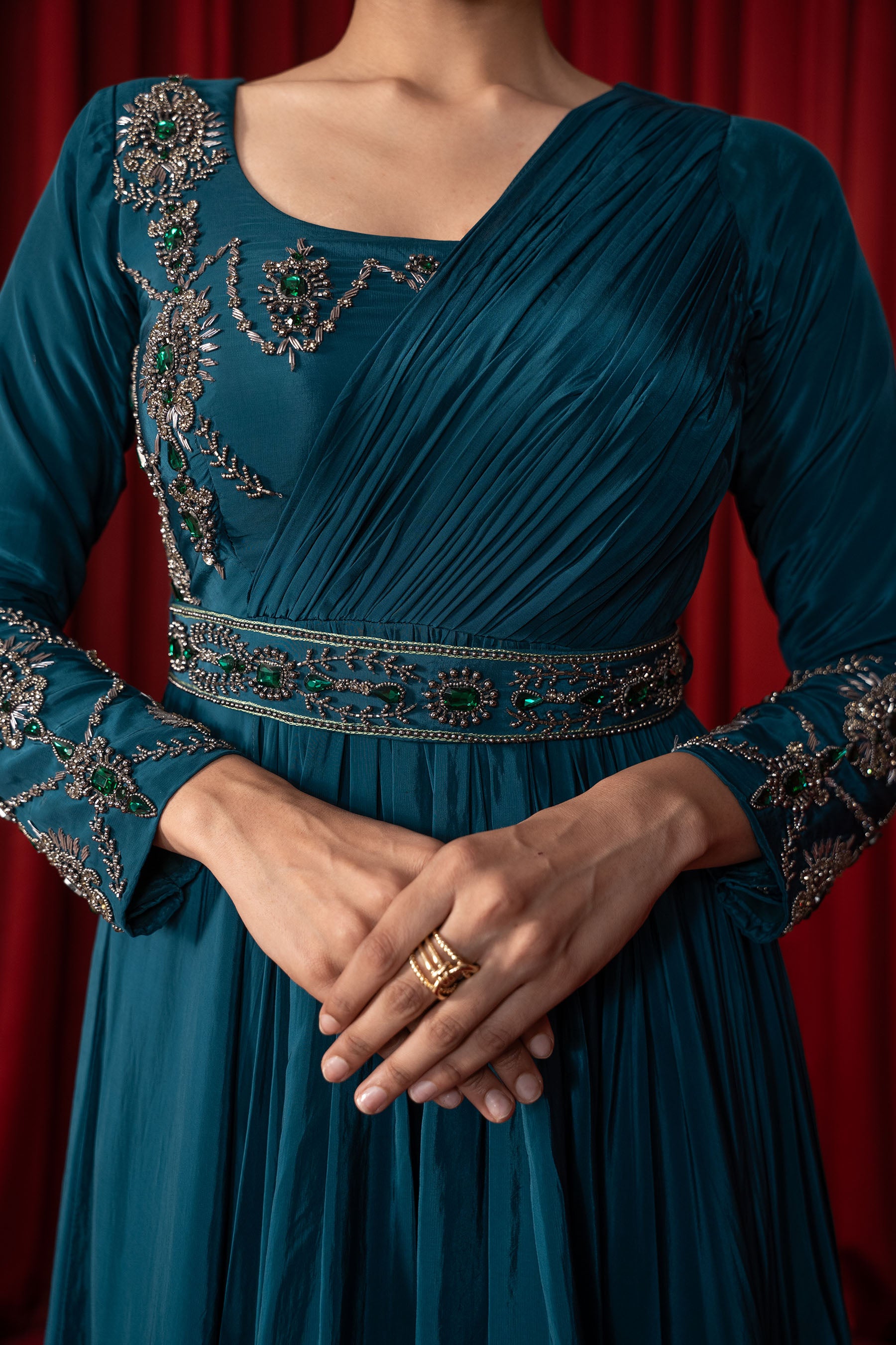 Work - Delicate stone, cutdana, thread and sequin embroidery on left shoulder, cuffs, and contoured waist belt