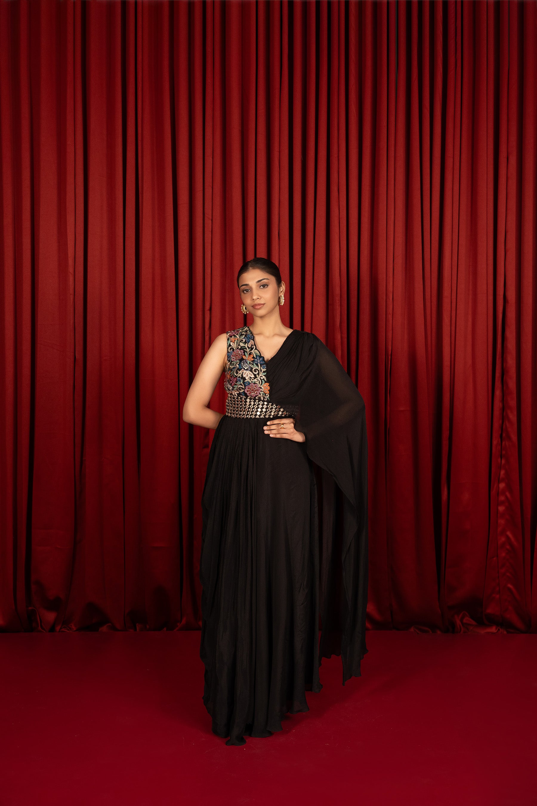 Work - Multicolour floral thread embroidery with mirror accents on one-shoulder bodice