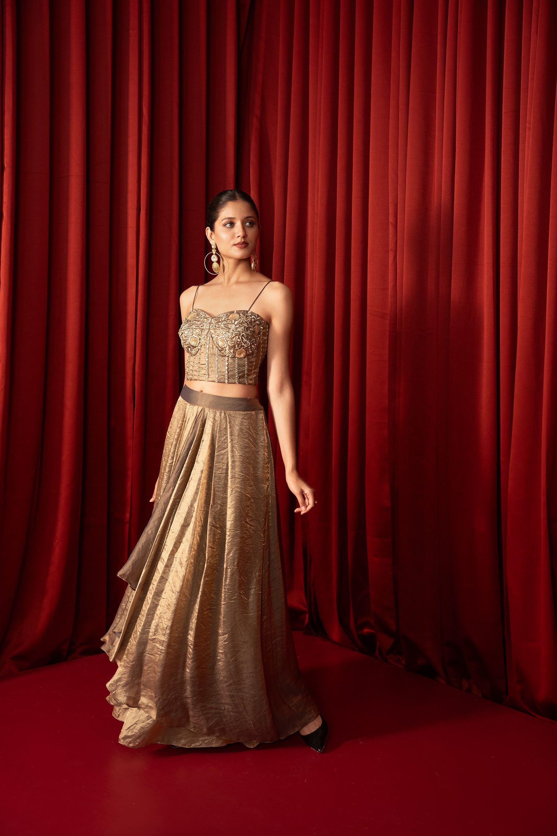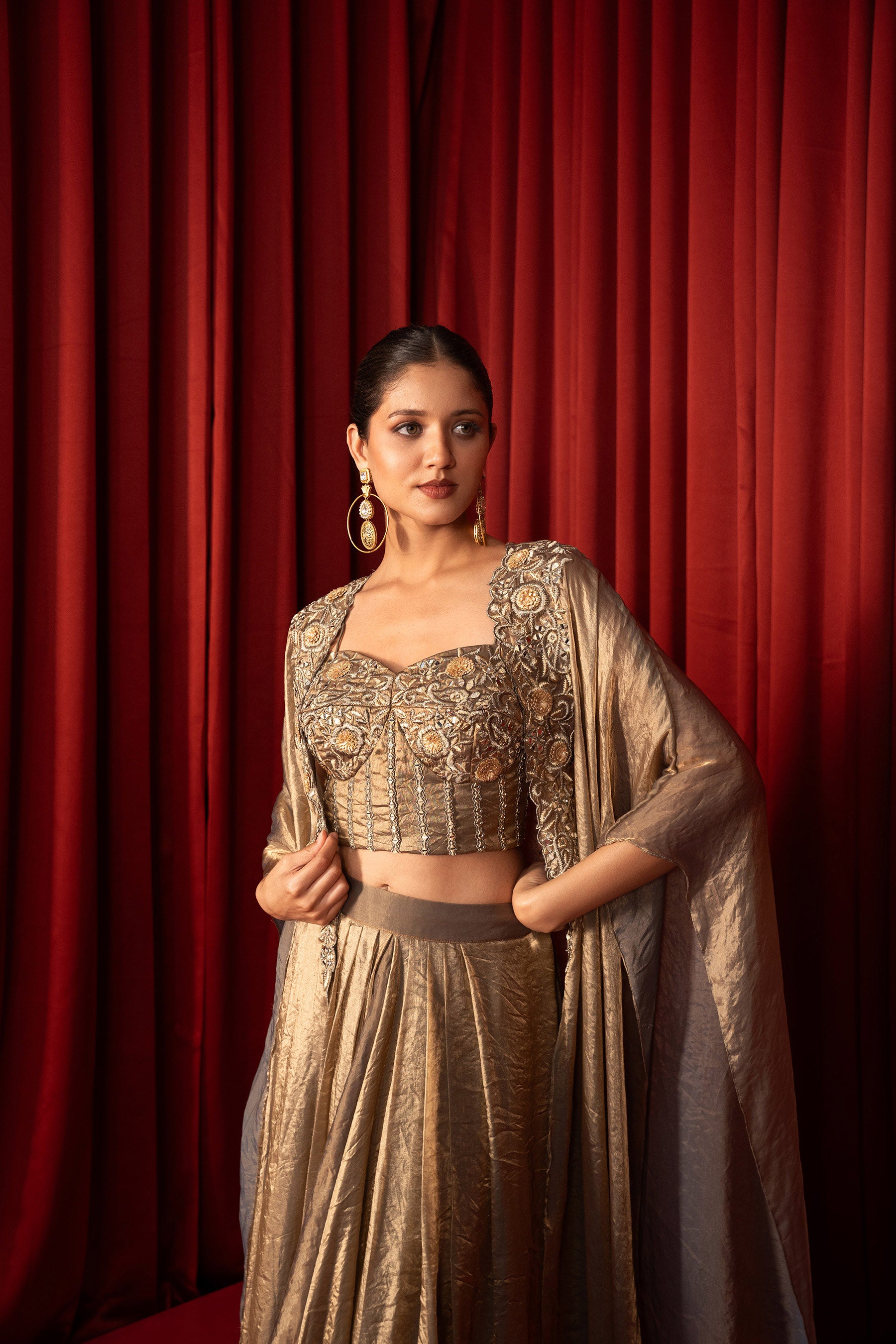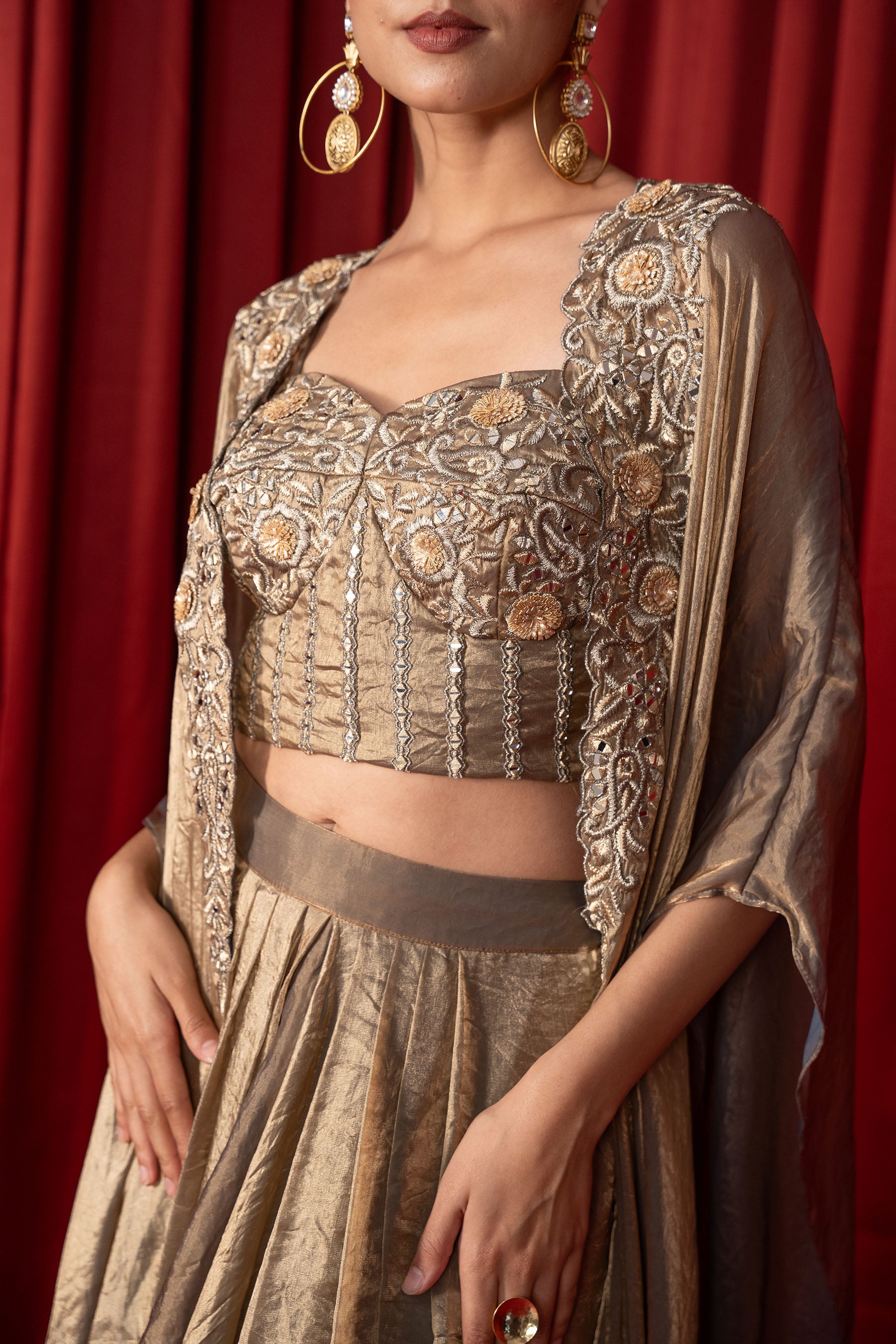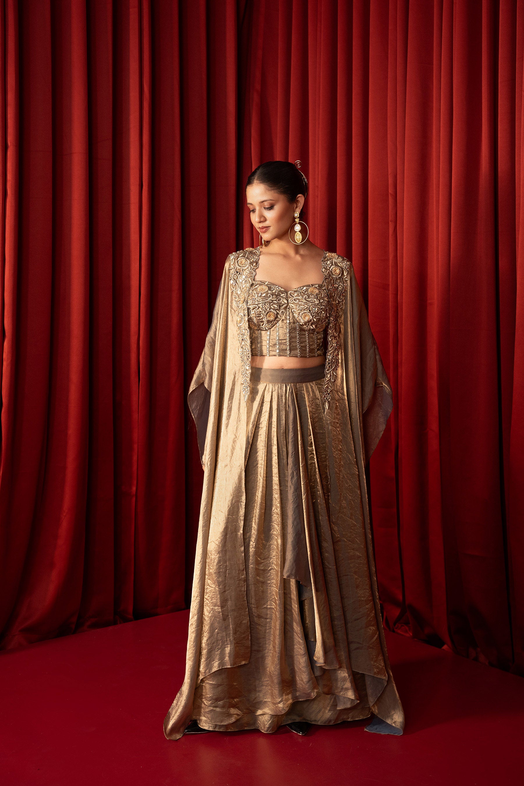 Work - Heavy gold thread and Mirror embroidery on the sweetheart-neck blouse and along the long cape jacket front