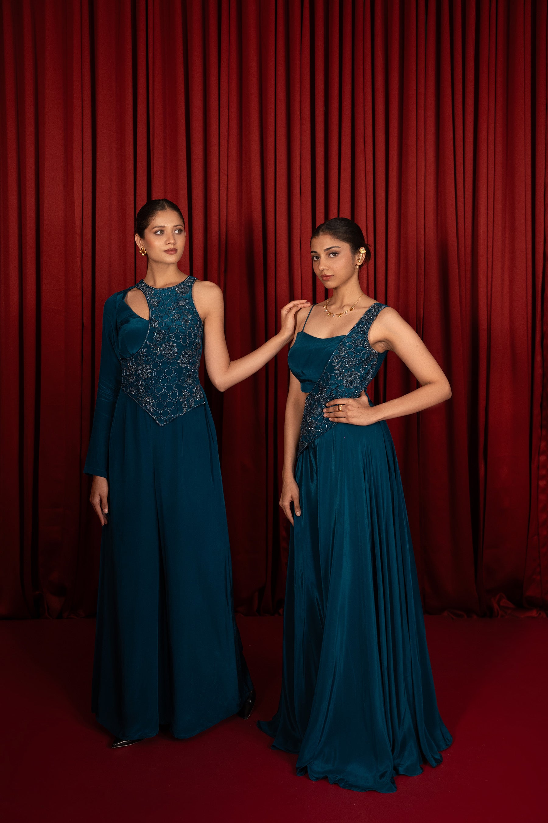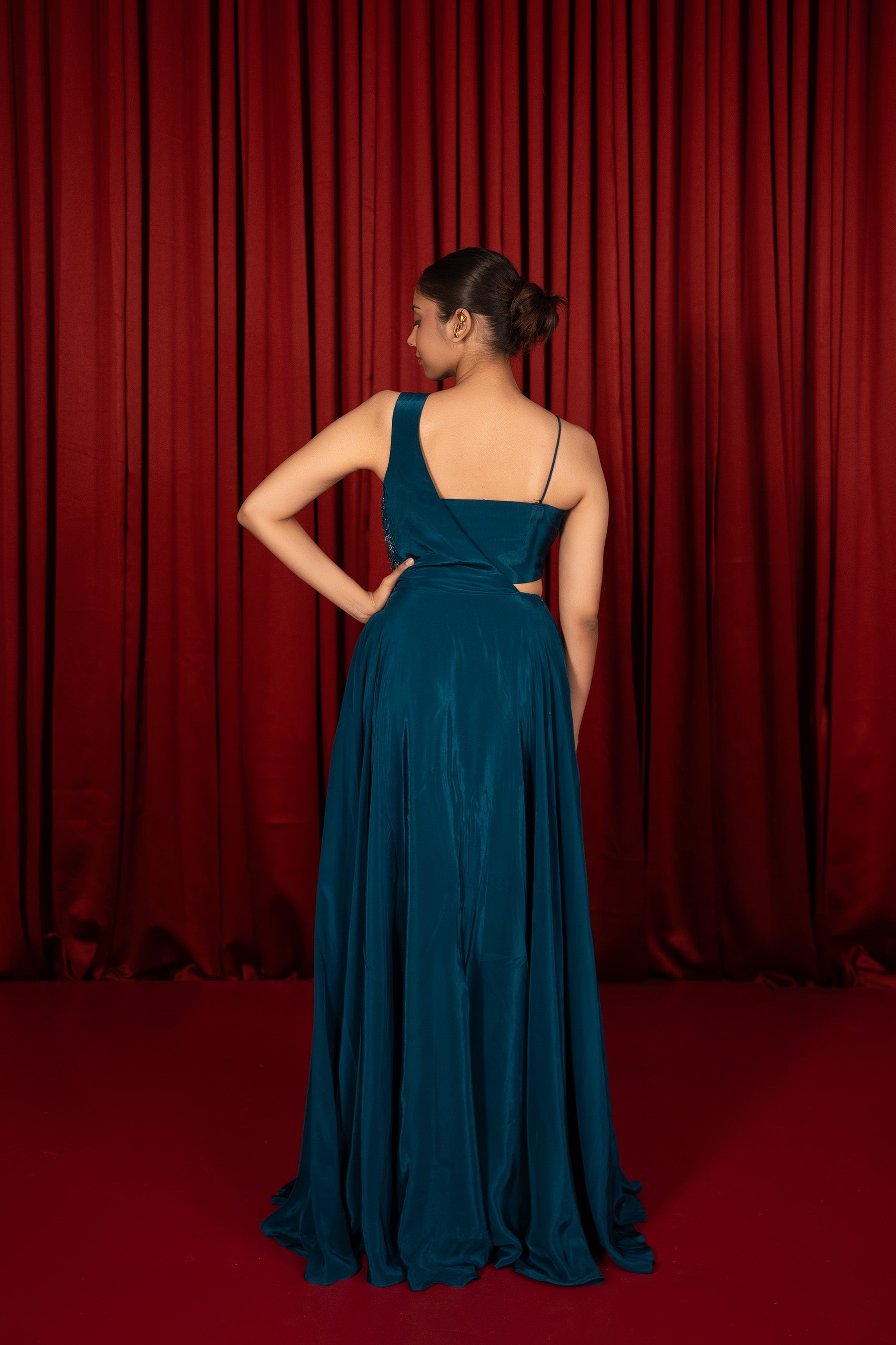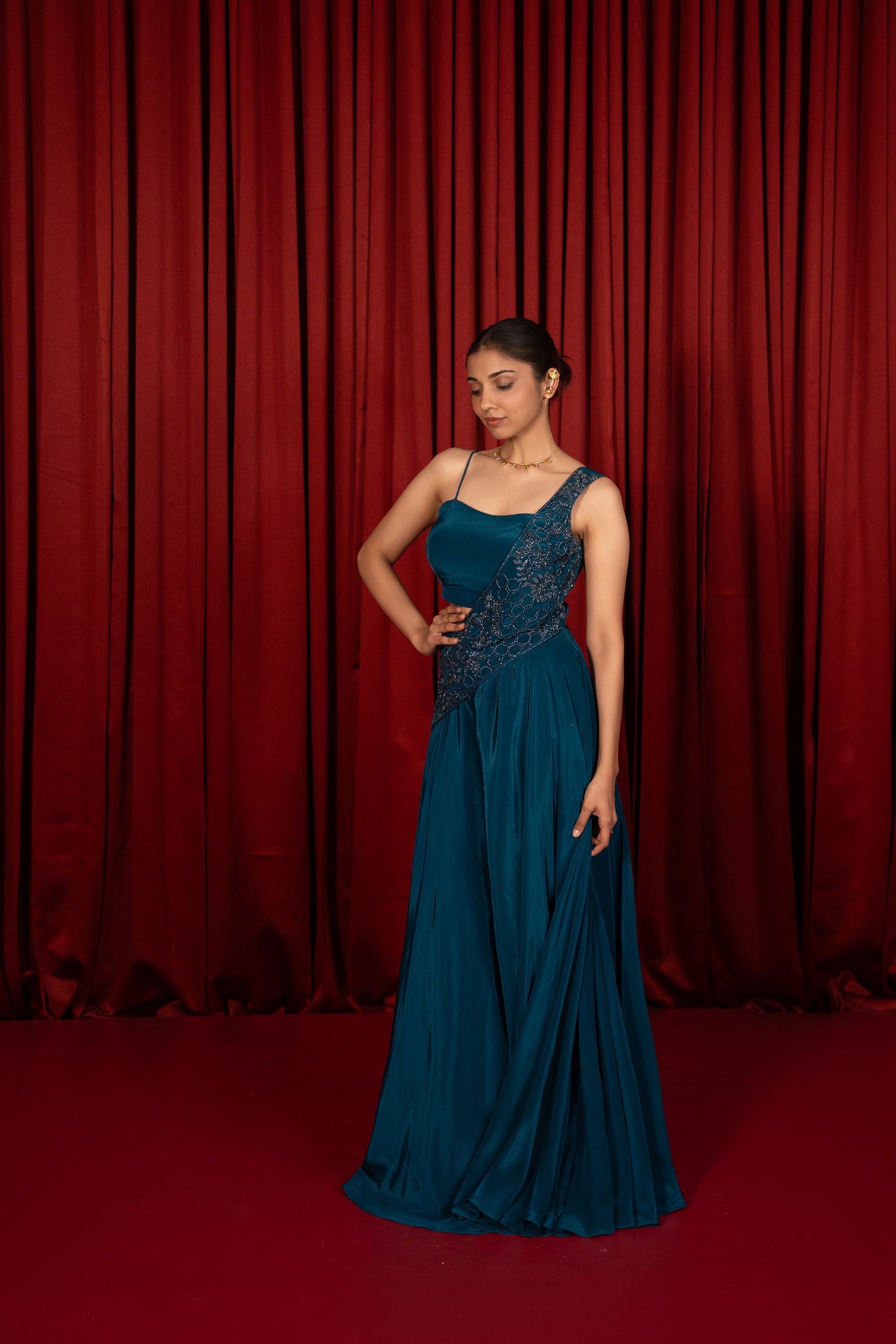 Work - Intricate tonal bead and thread embroidery on the asymmetric drape across bodice and waist