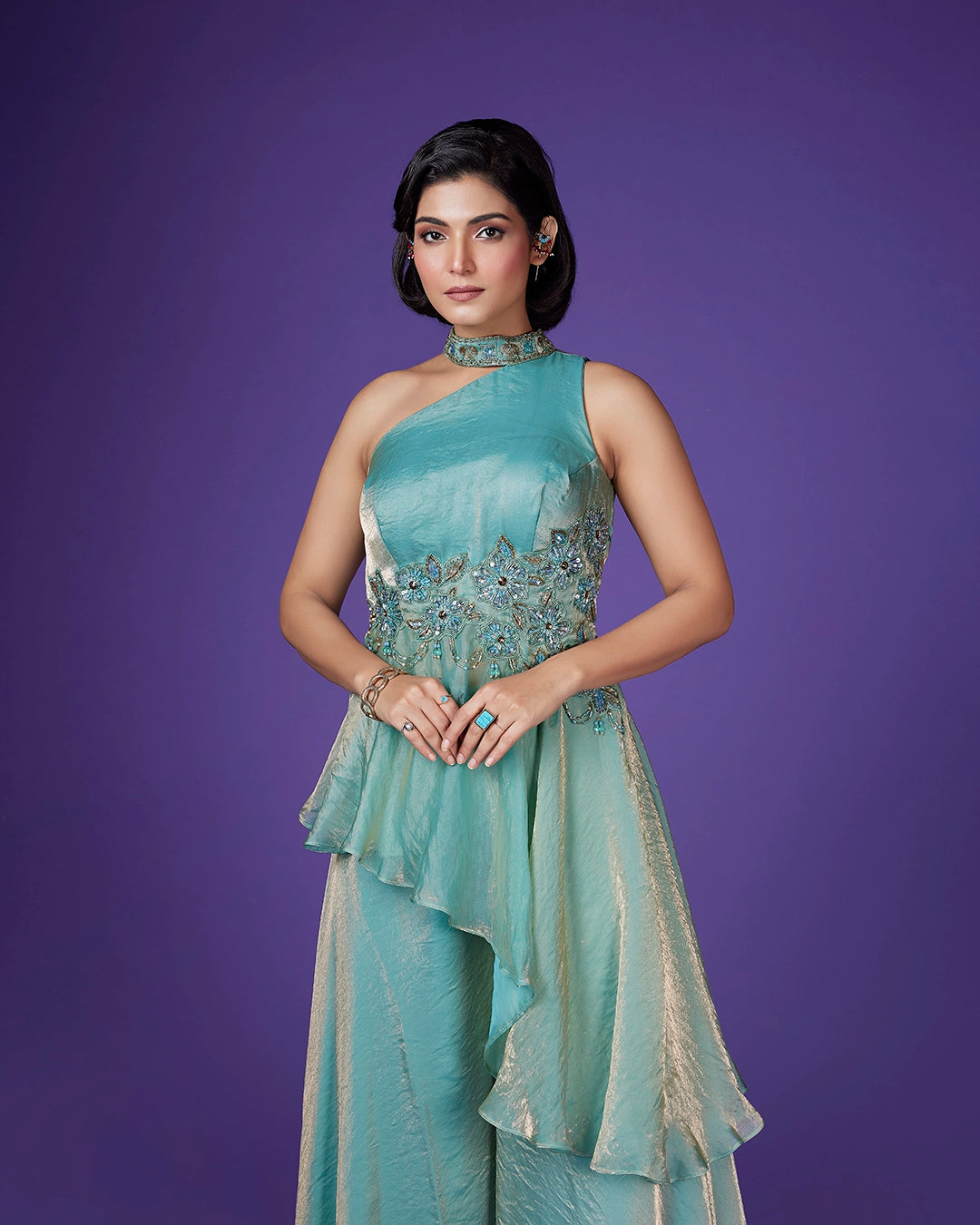 Work - Intricate hand embroidery with floral motifs at the waist featuring sequins, beads.