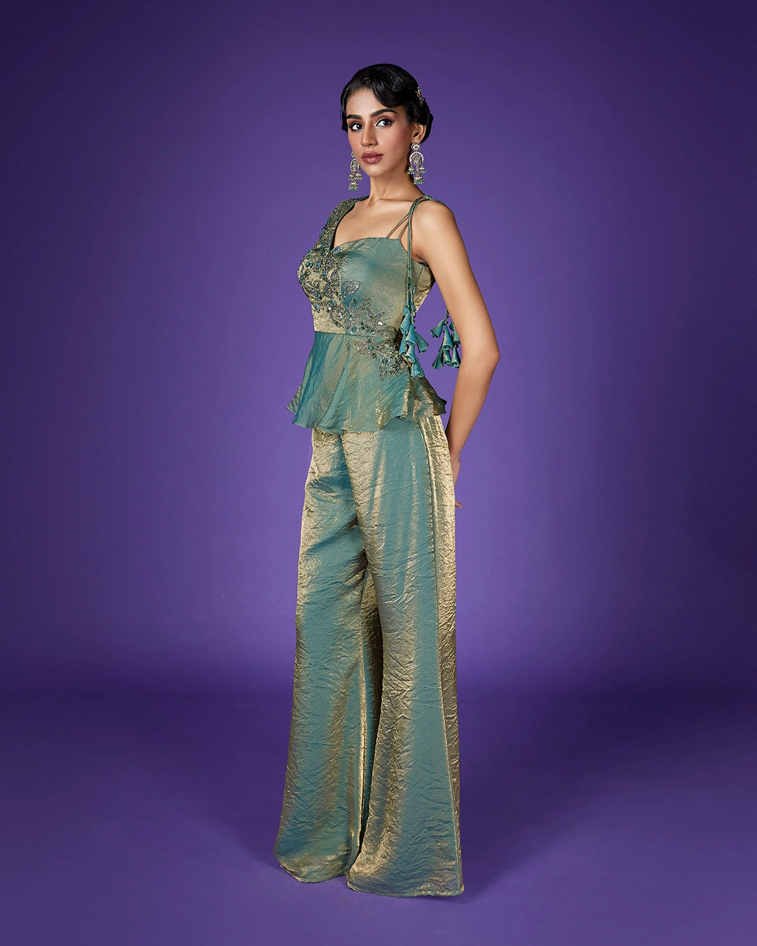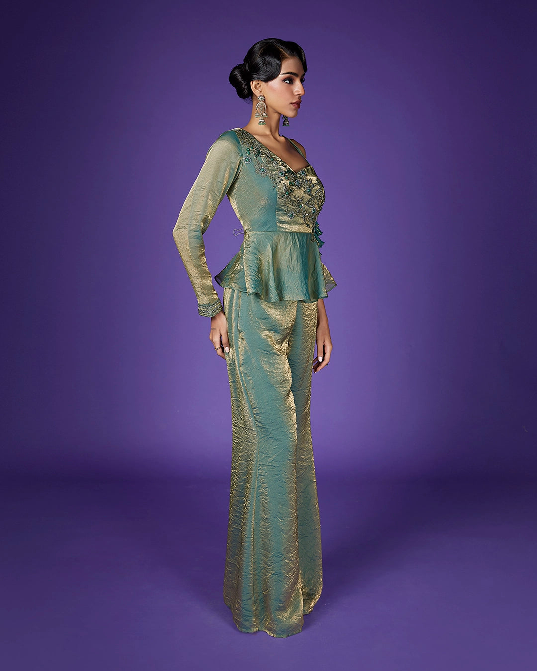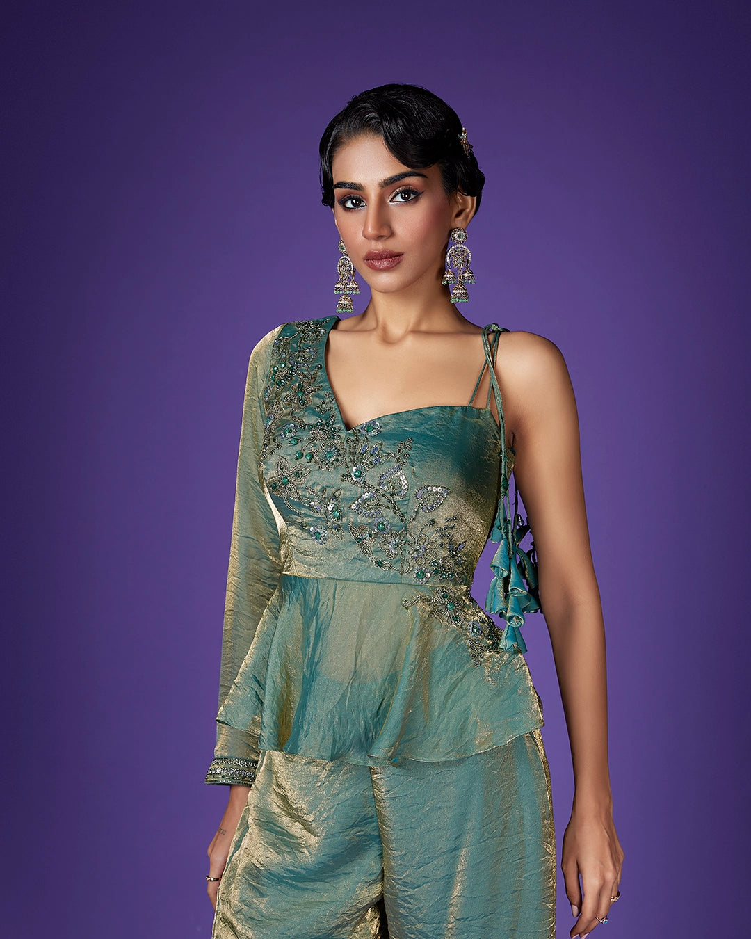Work – Hand embroidery with zari, resham, sequins, and bead work on yoke and neckline