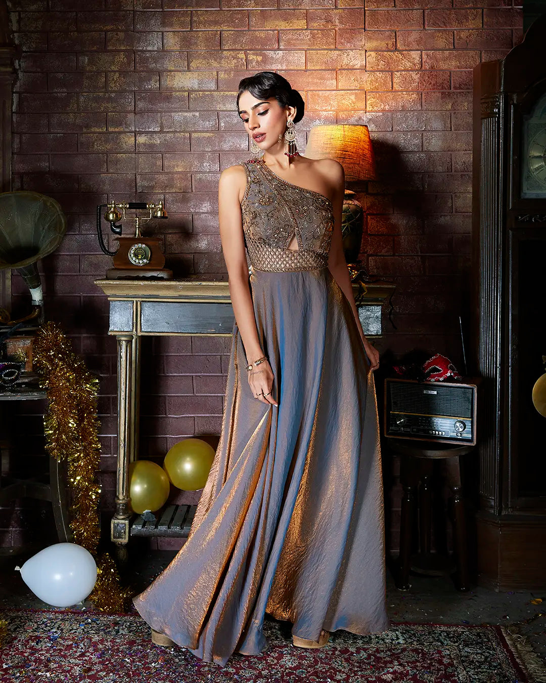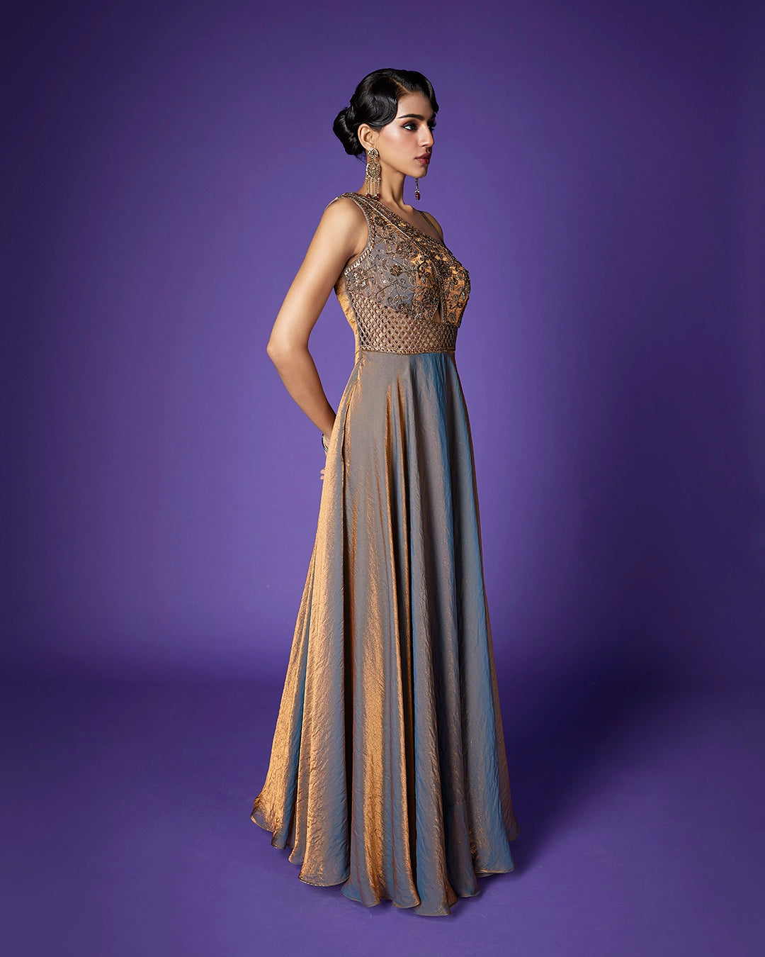 Work - Intricate floral embroidery with zari, resham, and sequin detailing & cut work on the waist.