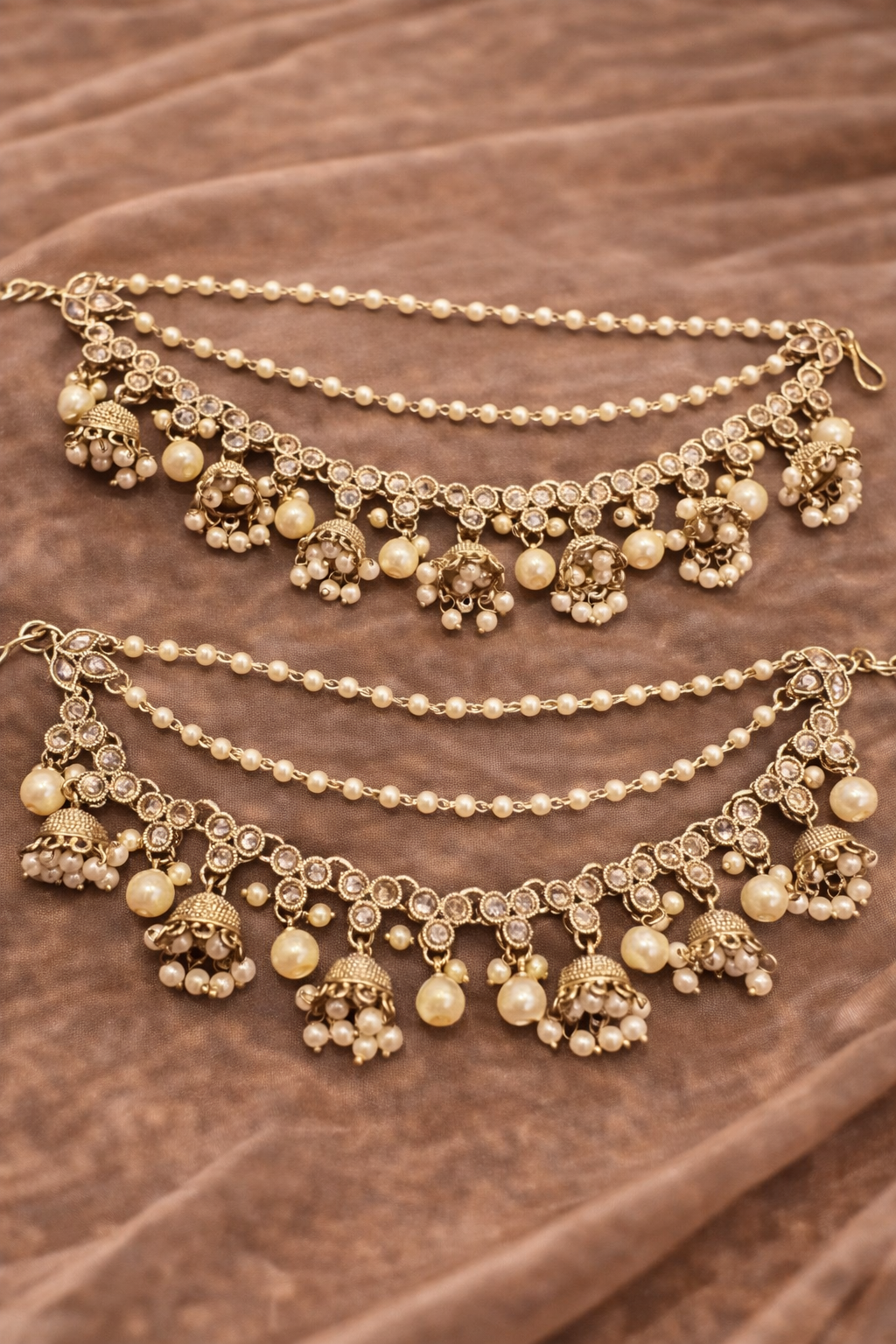 An intricate lattice of kundan and pearls, flowing into soft jhumki cascades.