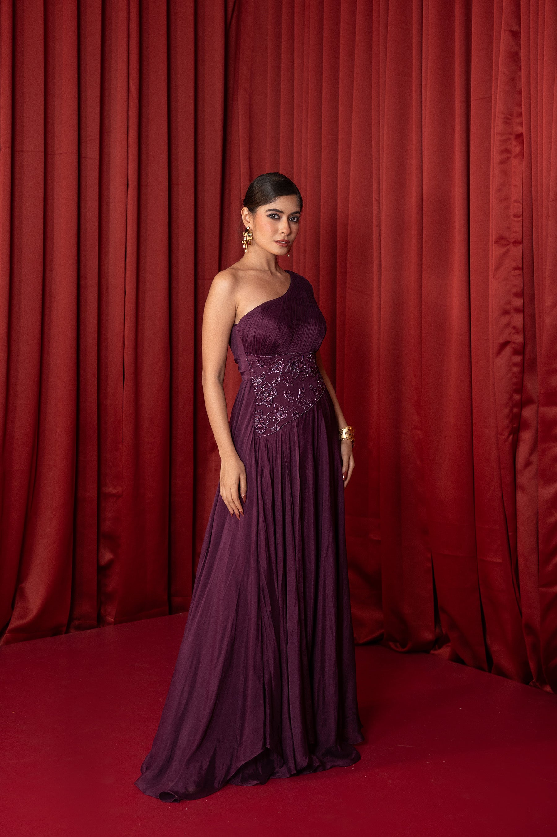 Neckline - One-shoulder neckline with ruched detailing